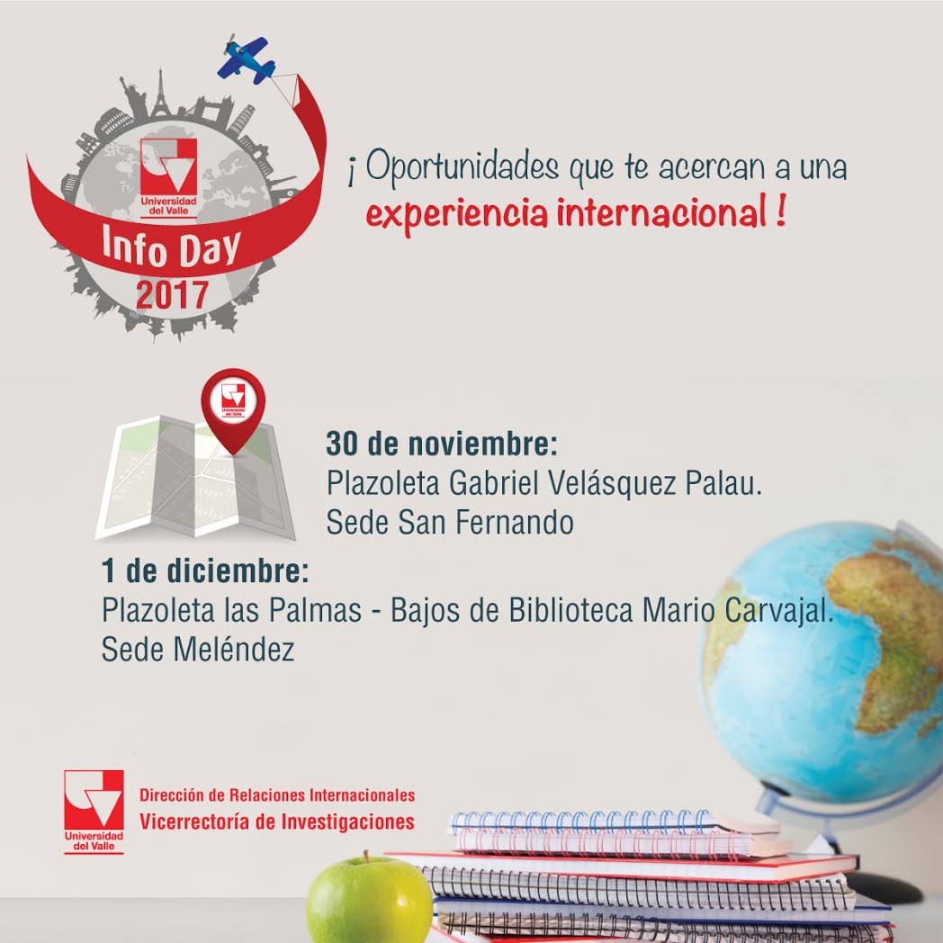 La Dirección de Relaciones Internacionales de la Universidad del Valle y la Oficina de Asuntos Internacionales de la Facultad de Salud, invitan a participar del Info Day 2017: Feria de posibilidades para estudios en el exterior. Una jornada de charlas informativas y paneles sobre opciones de intercambio, con actividades para estudiantes y profesores.