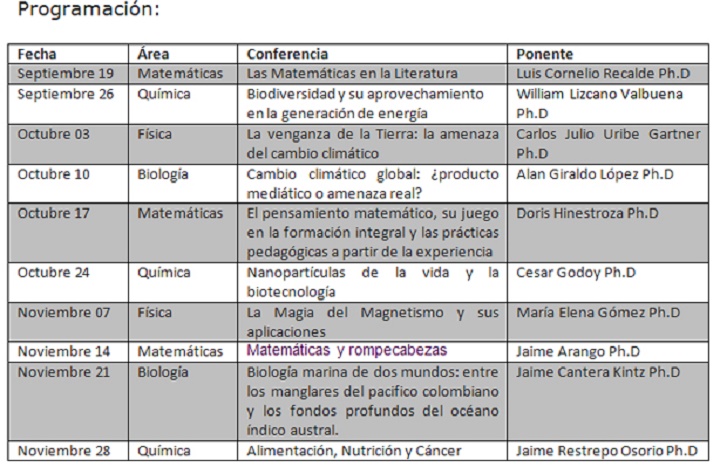 Con temáticas como nutrición y salud, la relación entre las matemáticas y la literatura, cambio climático, energías verdes y biología marina, entre otras, Ciencias en la Biblioteca ofrece a la sociedad la oportunidad de acercarse al universo científico en un lenguaje cotidiano, permitiéndole conocer de primera mano los aportes y aplicaciones que los expertos del alma mater de los vallecaucanos han hecho a nivel nacional y mundial.