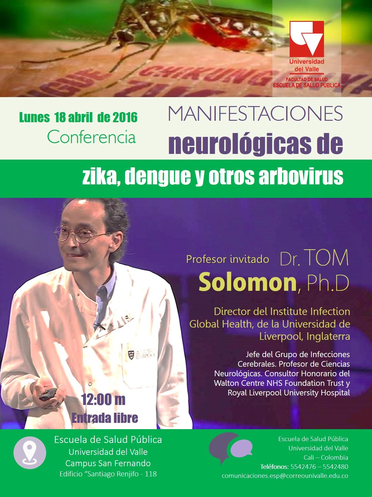 La Escuela de Salud Pública de la Universidad del Valle invita a la conferencia “Manifestaciones neurológicas del zika, dengue y otros arbovirus”, que se realizará este lunes 18 de abril, a las 12:00 m, en el Salón 1, Edificio Santiago Renjifo, Campus San Fernando. La entrada es libre.