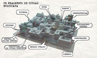 “Un Fragmento de Ciudad” es una propuesta de fragmento urbano continuo que conserva los límites físicos de la manzana y traspasa sus límites espaciales. Es un diseño que relaciona varios usos como viviendas, comercio, oficinas, equipamientos, parqueaderos y el espacio público; dejando el lugar respectivo y propio de cada uso.